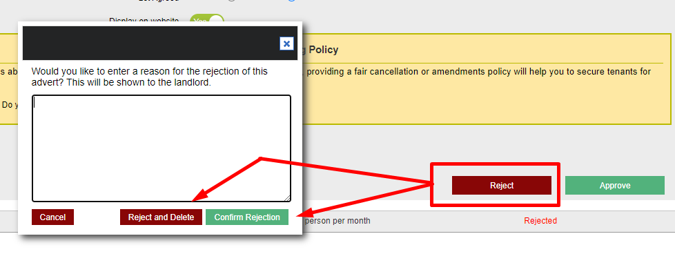 If the advert(s) is awaiting approval, landlords can still delete the advert by clicking on the Delete button as mentioned above. The way for administrators to delete them is to click on the Reject button shown below. You will then get the options of Confirm