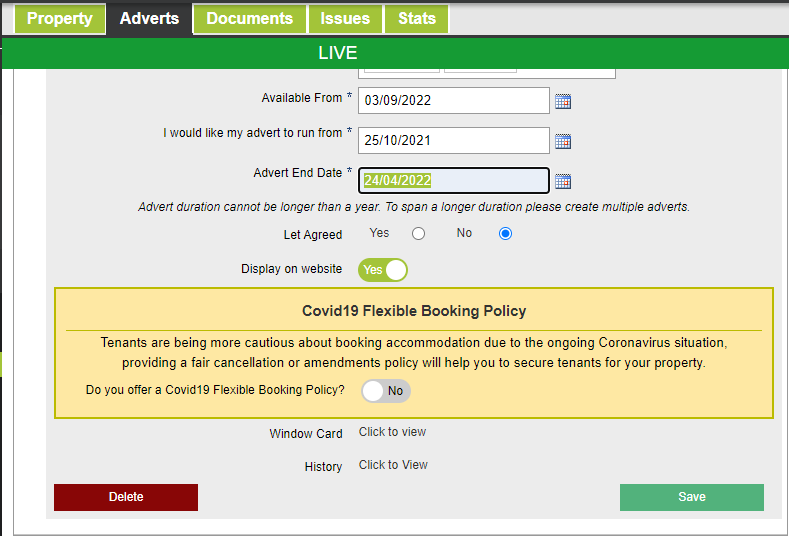 If the advert(s) has already been approved (regardless of whether it is live or not yet live), there will be a red delete button at the bottom-left of the advert that both administrators and landlords can see and use. Simply click that button to delete it permanently from the control site (a pop-up will appear asking you to confirm deletion - click to confirm and it will be permanently deleted from the account).