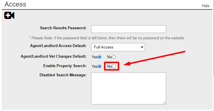 In the Access section of the page, click on 'No' under the 'Enable Property Search' field: