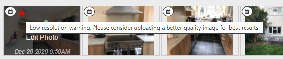 As a guide, a photo measuring 600 x 400 pixels will show the red warning triangle.